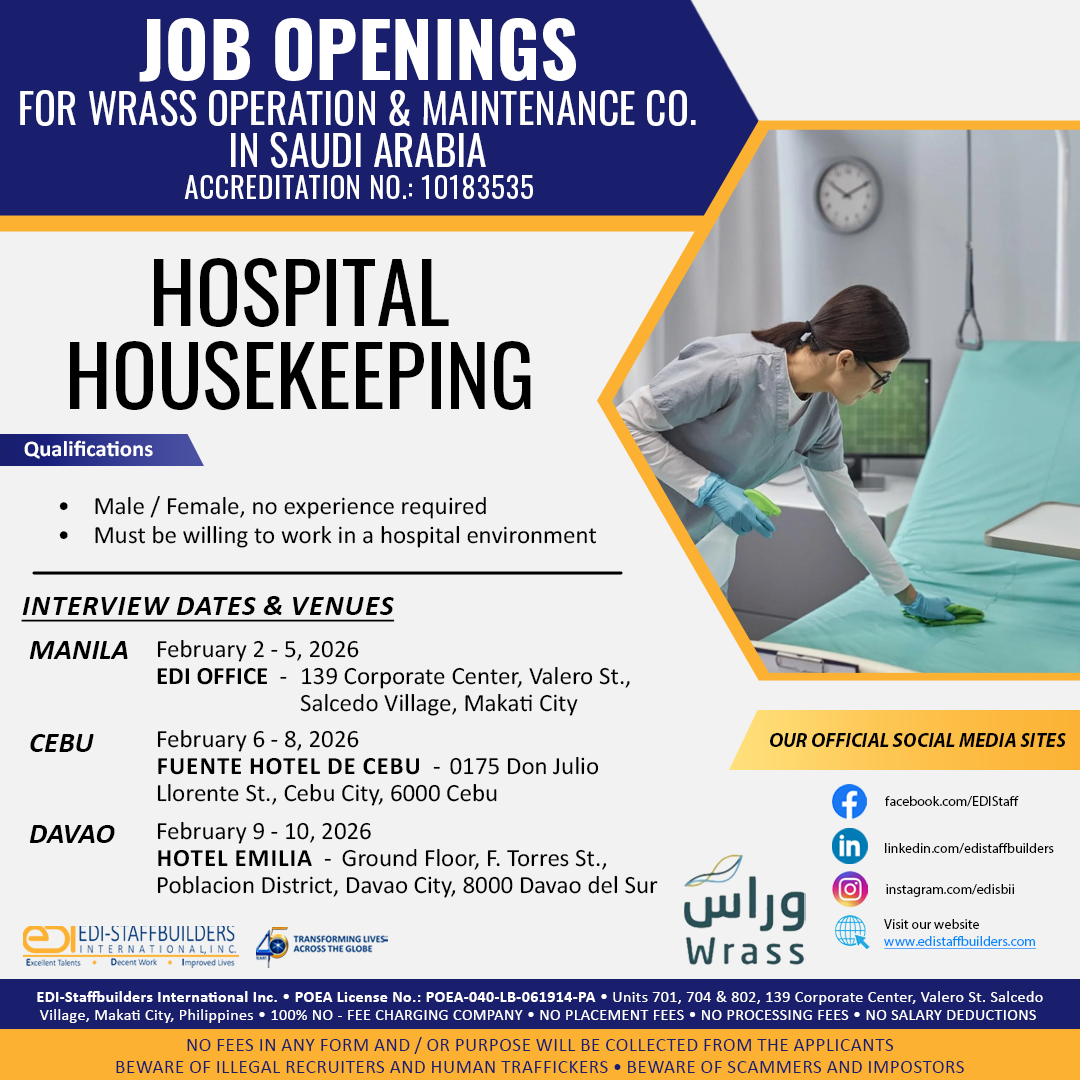 Through our Processing and Dispatch Group, we shall undertake in your behalf all the pertinent activities for the speedy dispatch of selected candidates, including the close coordination of with the Philippine Overseas Employment Administration (POEA), the government body tasked to regulate all overseas recruitment agencies as well as Overseas Filipino Workers.
